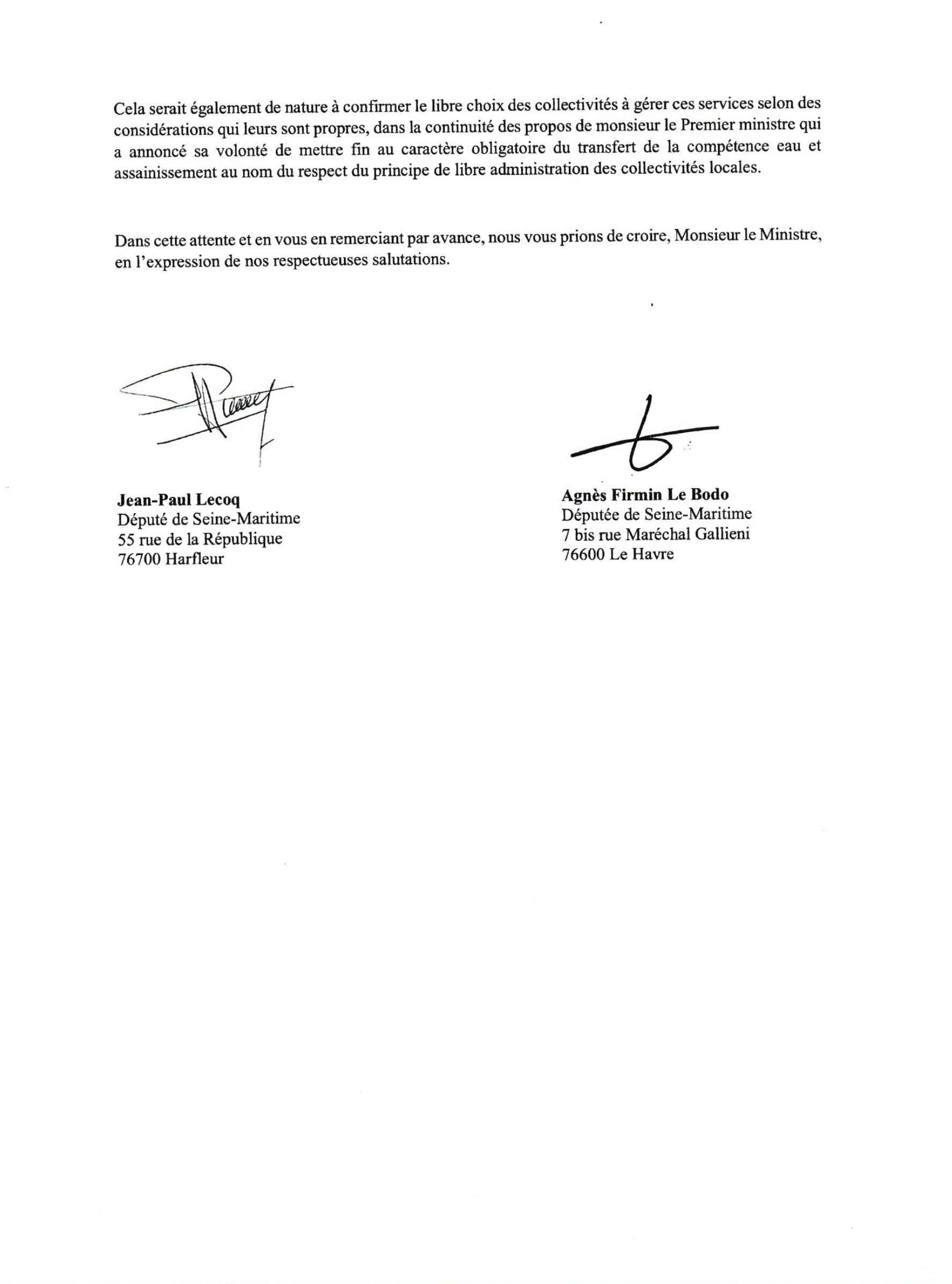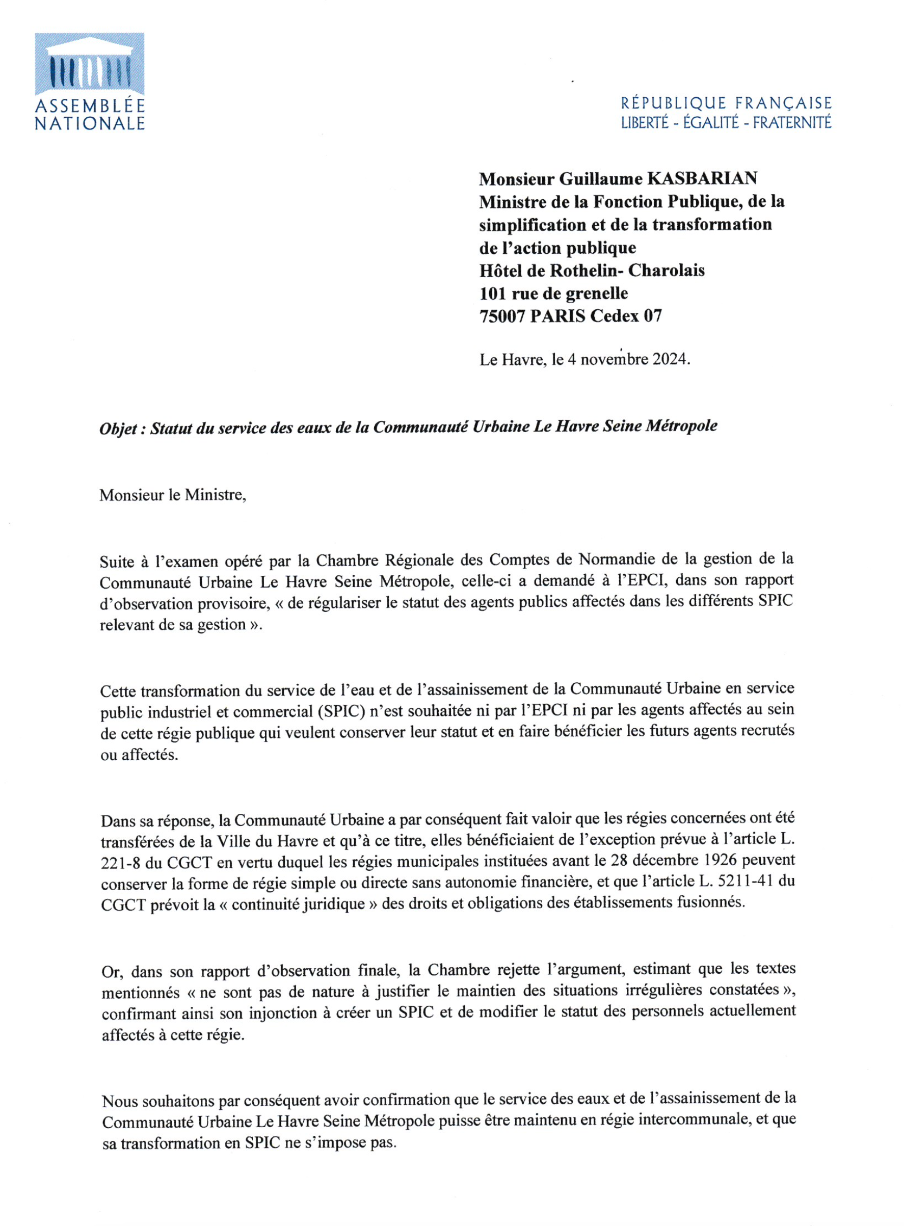 Comme je l’ai proposé au Conseil communautaire, je viens donc de saisir avec ma collègue Agnès Firmin Le Bodo le ministre pour avoir confirmation que le service des eaux et de l’assainissement de la Communauté Urbaine Le Havre Seine Métropole peut être maintenu en régie intercommunale, et que sa transformation en SPIC ne s’impose pas.