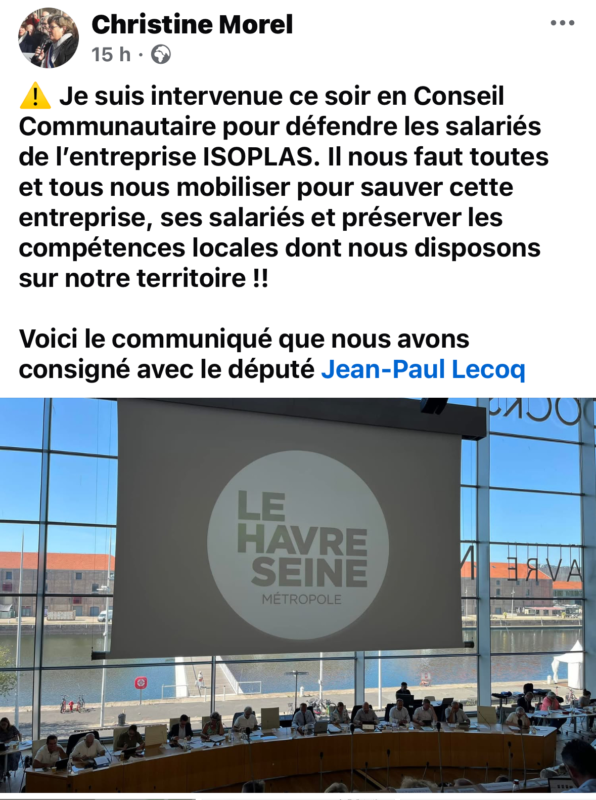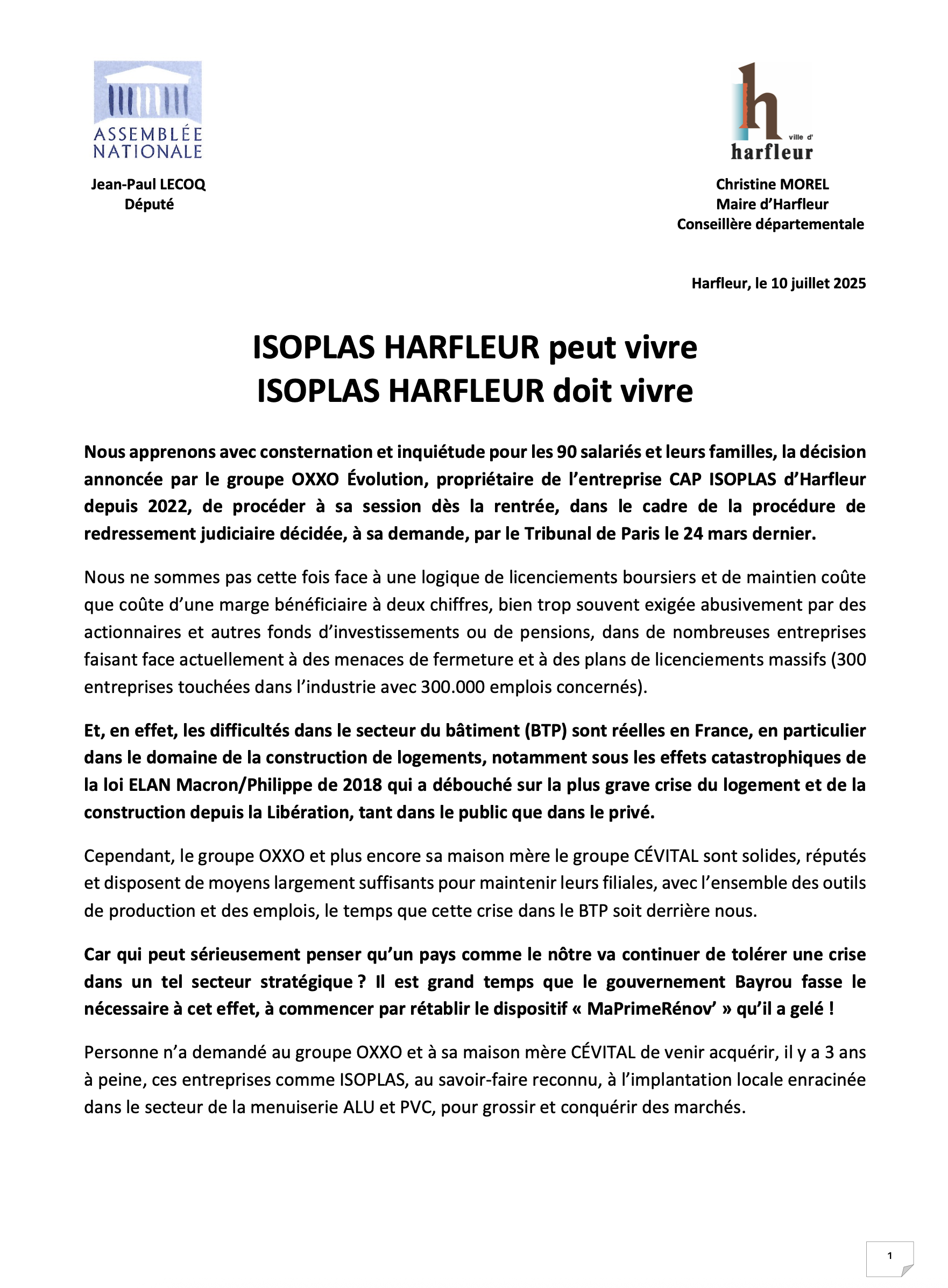 10 juillet - Avec Christine Morel, Maire d’Harfleur, nous apprenons avec consternation et inquiétude pour les 90 salariés et leurs familles, la décision annoncée par le groupe OXXO Évolution, propriétaire de l’entreprise CAP ISOPLAS d’Harfleur depuis 2022, de procéder à sa session dès la rentrée, dans le cadre de la procédure de redressement judiciaire décidée, à sa demande, par le Tribunal de Paris le 24 mars dernier.
