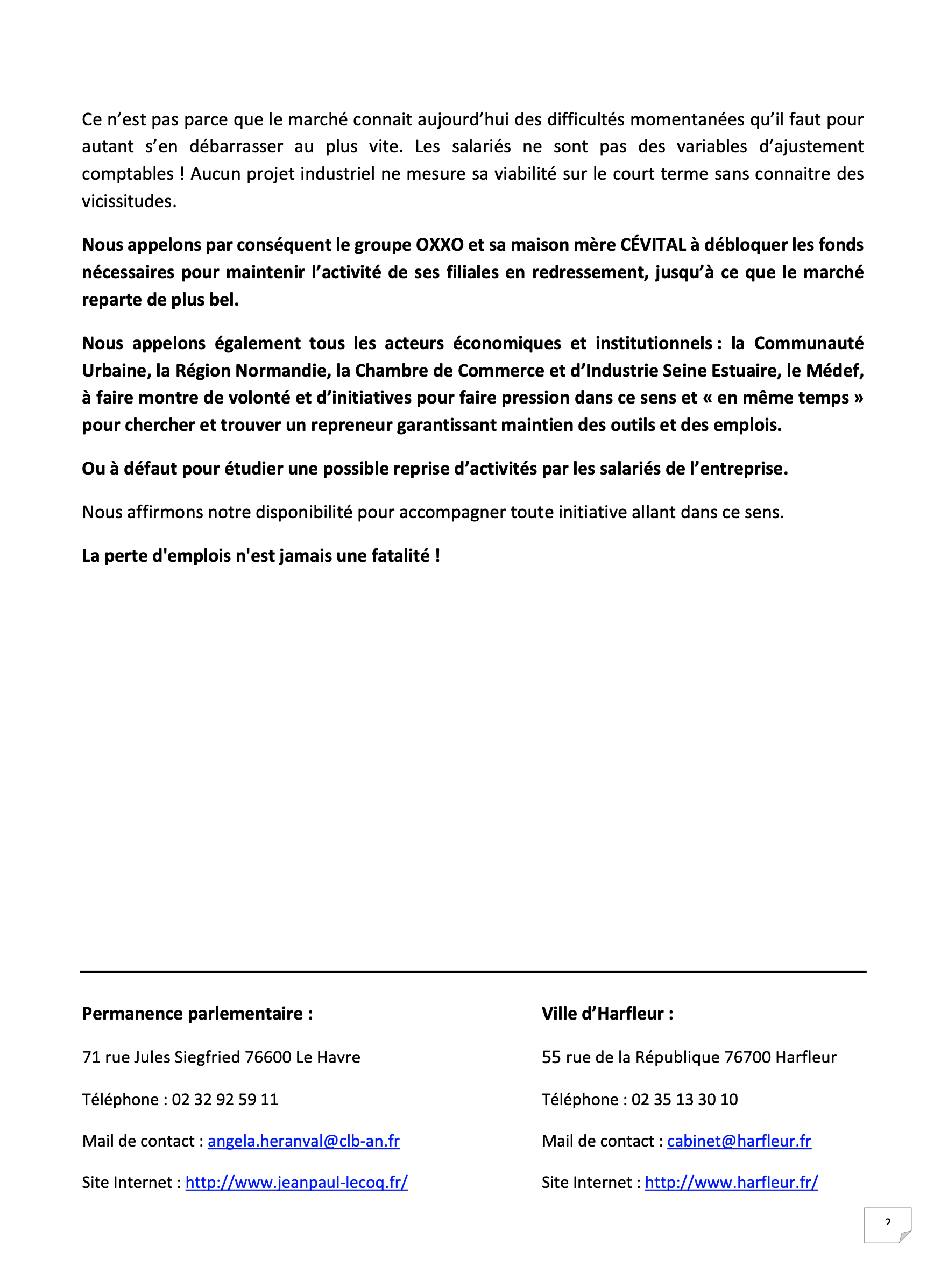 Nous appelons également tous les acteurs économiques et institutionnels : la Communauté Urbaine, la Région Normandie, la Chambre de Commerce et d’Industrie Seine Estuaire, le Médef, à faire montre de volonté et d’initiatives pour faire pression dans ce sens et « en même temps » pour chercher et trouver un repreneur garantissant maintien des outils et des emplois.