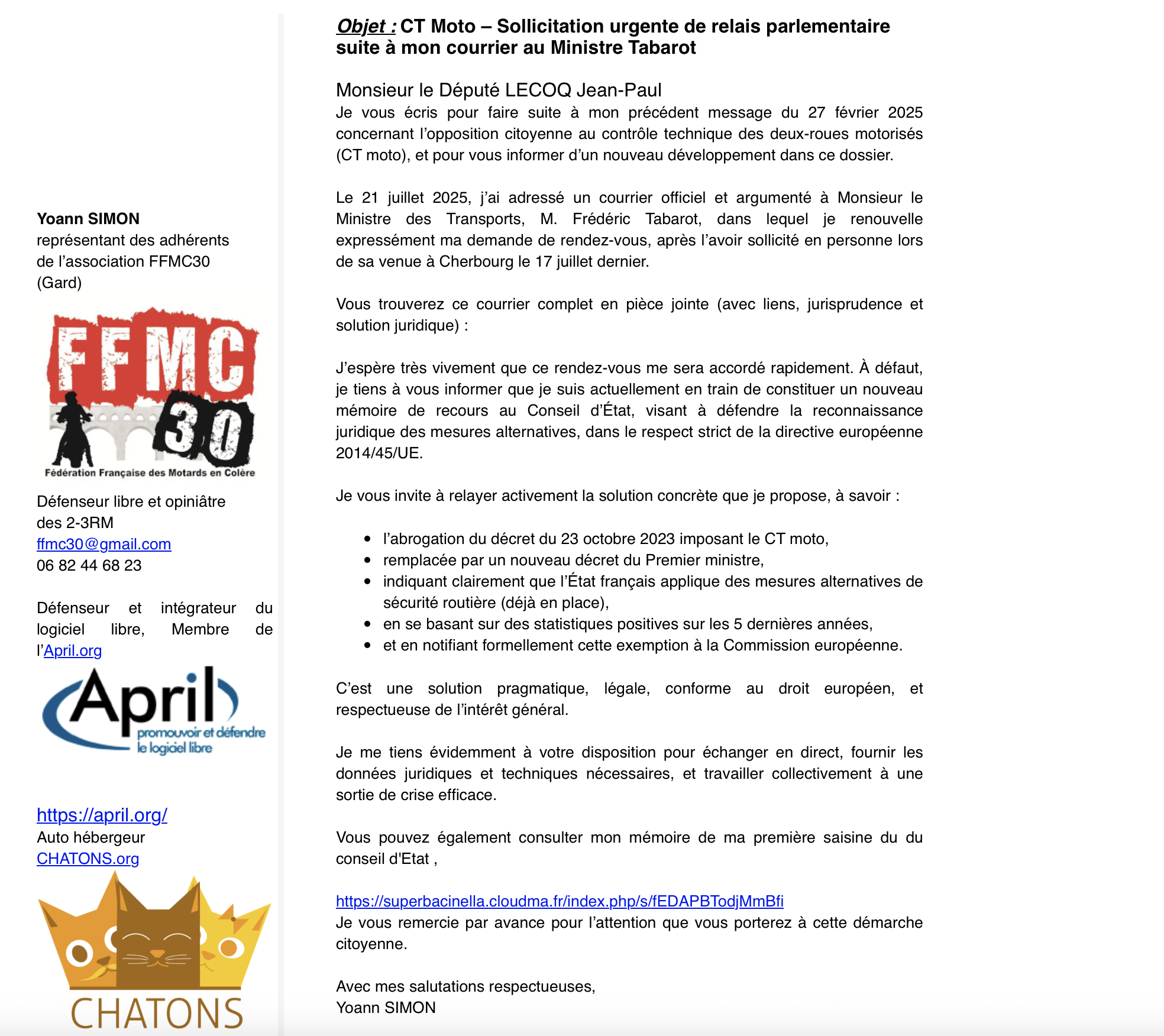 23 juillet - Alors que les gouvernements Macron s’entêtent à durcir les obligations du contrôle technique imposées aux motos, j’apprends que la très responsable et très active FFMC, Fédération Française des Motards en Colère ne parvient pas à être reçue par le Ministre des Transports.