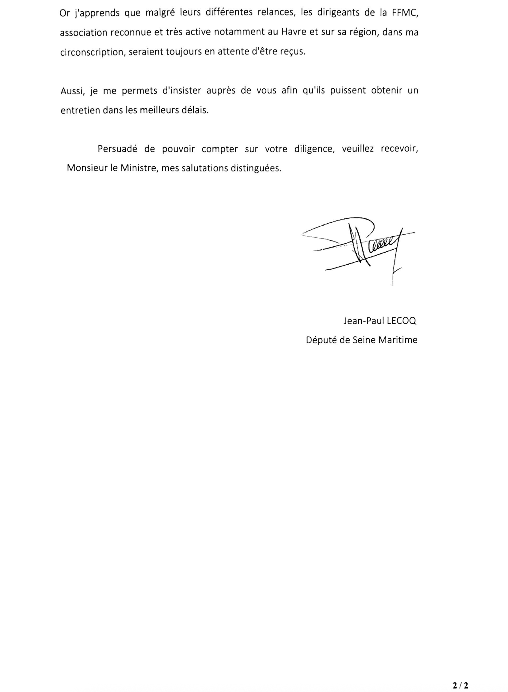 J’interviens auprès du Ministre pour que la FFMC obtienne un entretien dans les meilleurs délais.