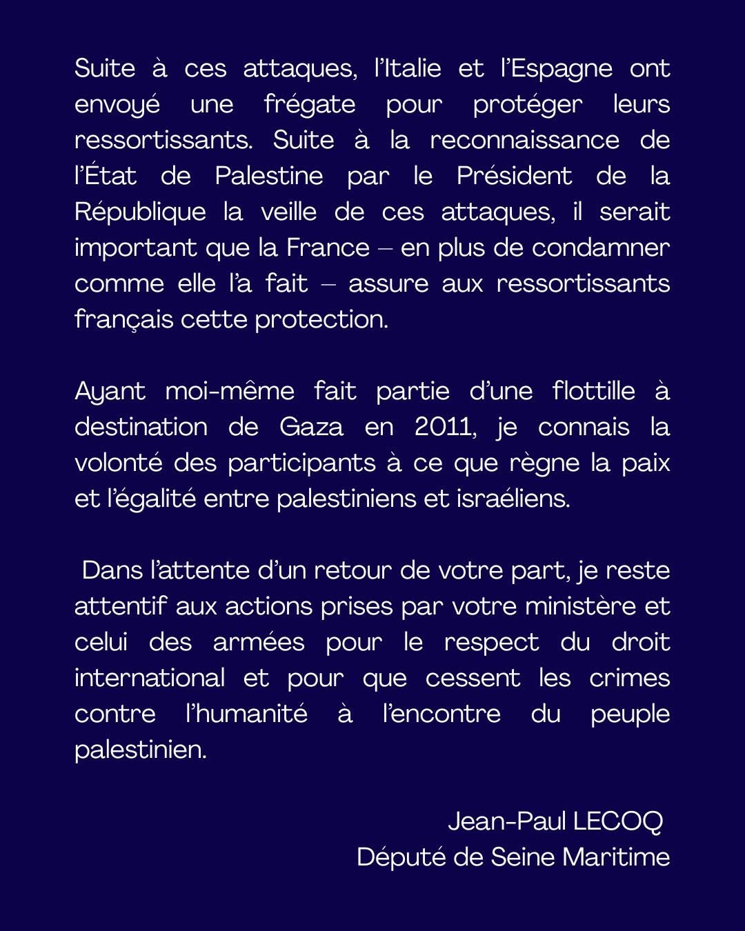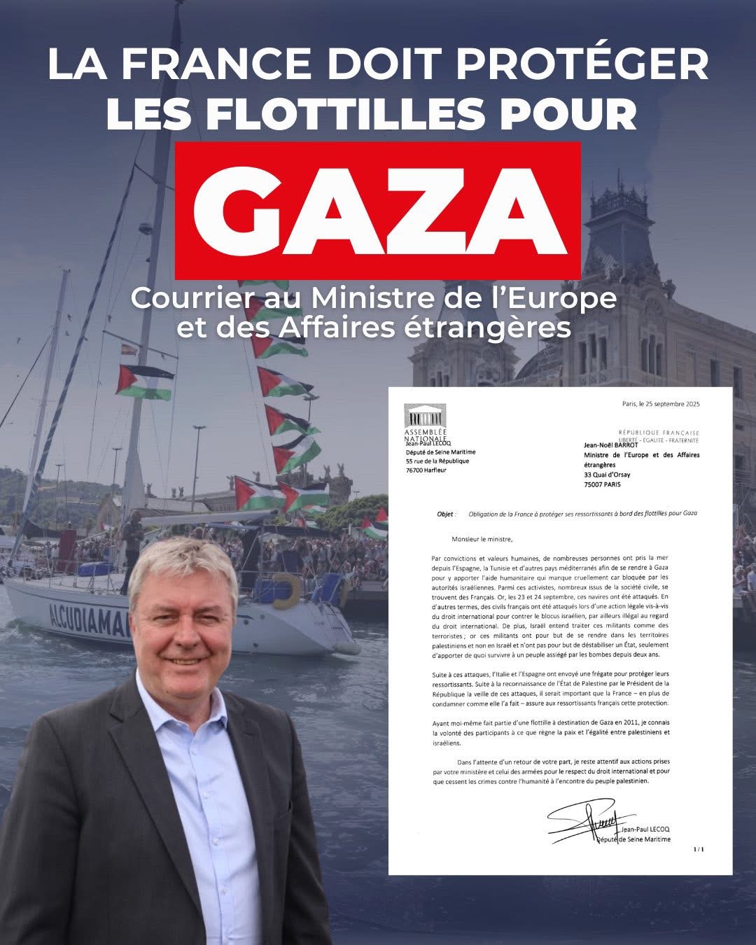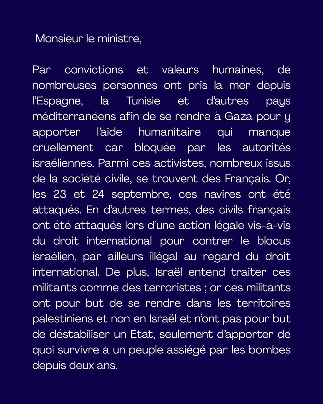 25 septembre - J’ai interpellé le ministre de l’Europe et des Affaires étrangères car il est important, et c’est une suite logique à la reconnaissance de l’État de Palestine, de protéger les flottilles parties pour apporter de l’aide humanitaire à Gaza.