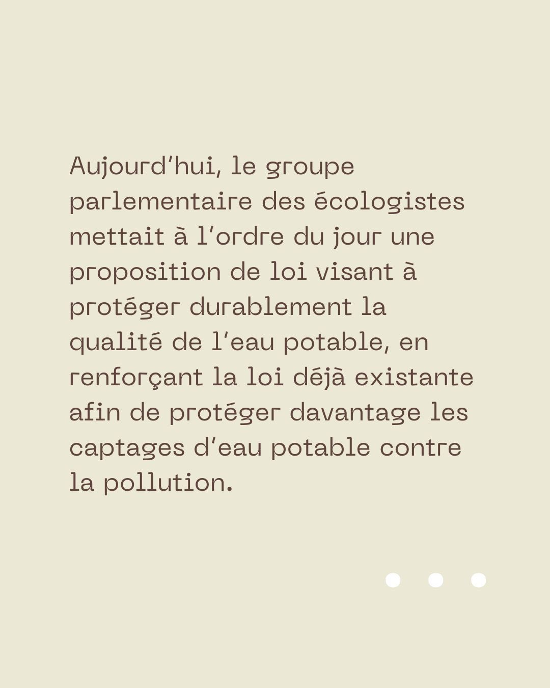 Aujourd’hui, le groupe parlementaire des écologistes mettait à l’ordre du jour une proposition de loi visant à protéger durablement la qualité de l’eau potable, en renforçant la loi déjà existante afin de protéger davantage les captages d’eau potable contre la pollution.