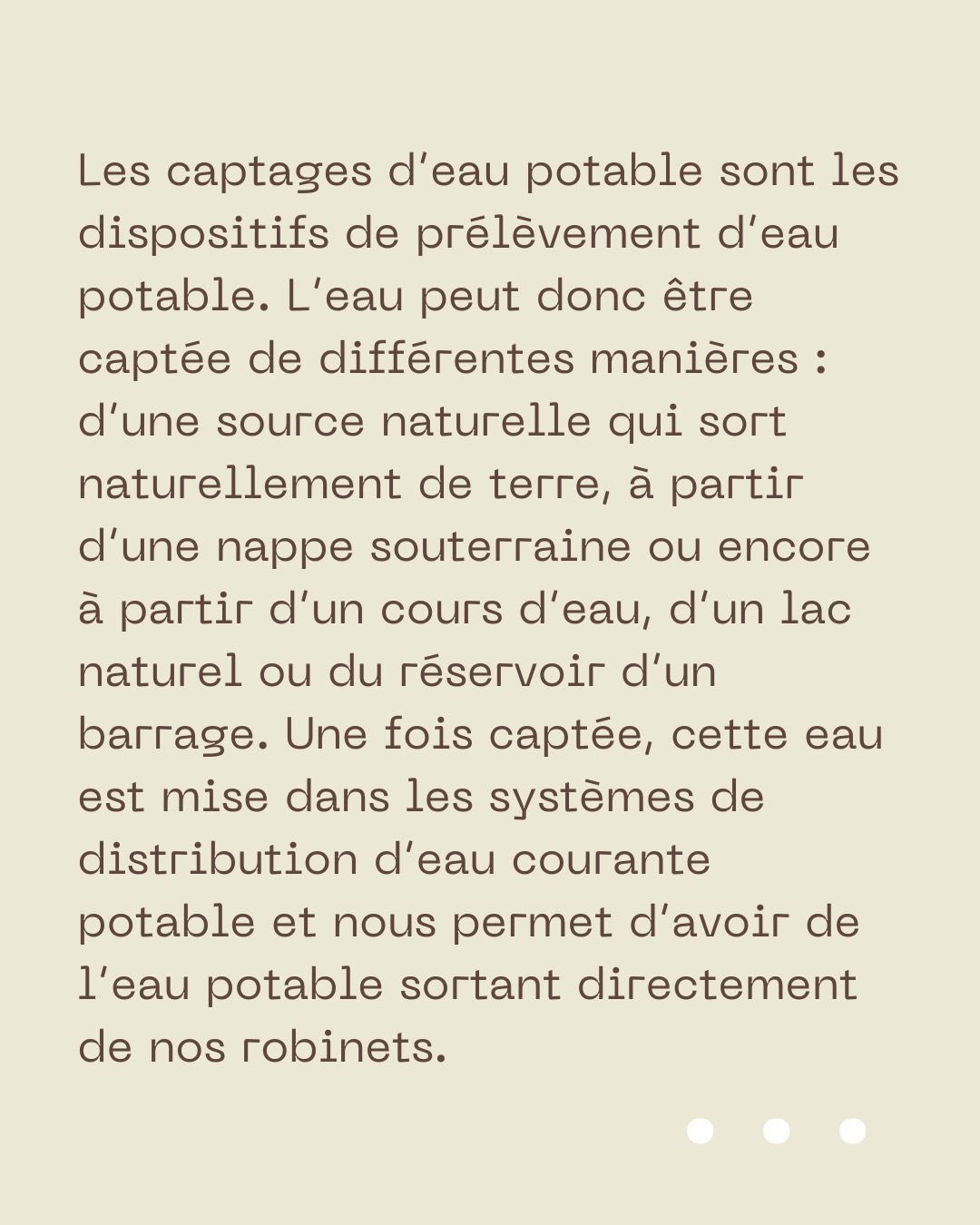 Les captages d’eau potable sont les dispositifs de prélèvement d’eau potable. L’eau peut donc être captée de différentes manières : d’une source naturelle qui sort naturellement de terre, à partir d’une nappe souterraine (où on va donc chercher l’eau sous la terre) ou encore à partir d’un cours d’eau, d’un lac naturel ou du réservoir d’un barrage. Une fois captée, cette eau est mise dans les systèmes de distribution d’eau courante potable et nous permet d’avoir de l’eau potable sortant directement de nos robinets.
