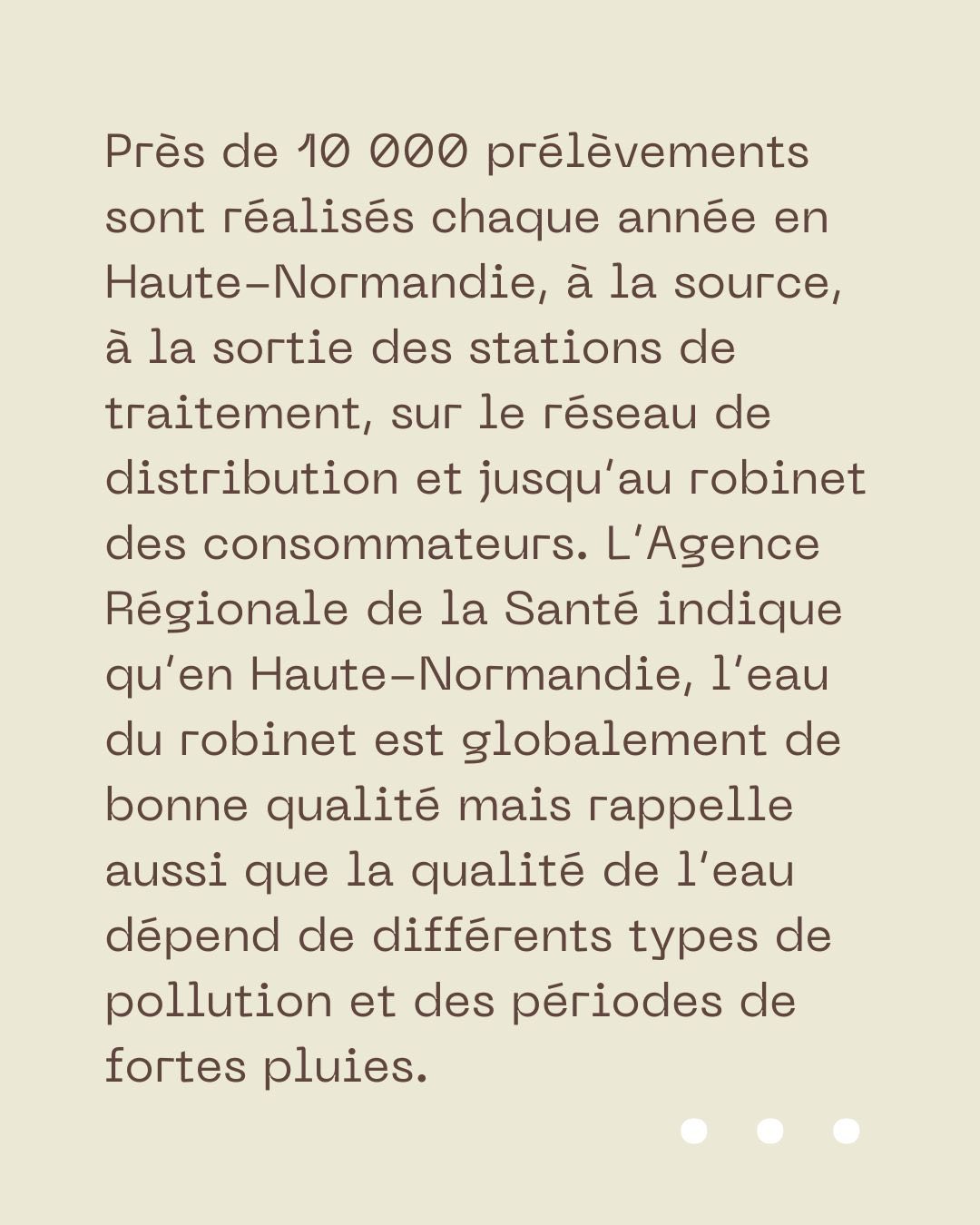 Près de 10 000 prélèvements sont réalisés chaque année en Haute-Normandie, à la source, à la sortie des stations de traitement, sur le réseau de distribution et jusqu’au robinet des consommateurs. L’Agence Régionale de la Santé indique qu’en Haute-Normandie, l’eau du robinet est globalement de bonne qualité mais rappelle aussi que la qualité de l’eau dépend de différents types de pollution et des périodes de fortes pluies.