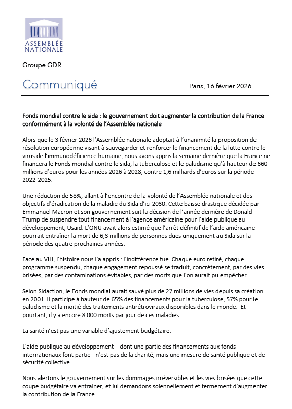 13 février - La proposition de résolution européenne visant à sauvegarder et renforcer le financement en faveur de la lutte contre le virus de l’immunodéficience humaine a reçu un soutien complet de l’Assemblée Nationale. Pendant le débat, la ministre de la Santé nous affirmait ne pas connaître le montant qui allait être alloué au Fonds mondial pour le sida, la tuberculose et le paludisme...