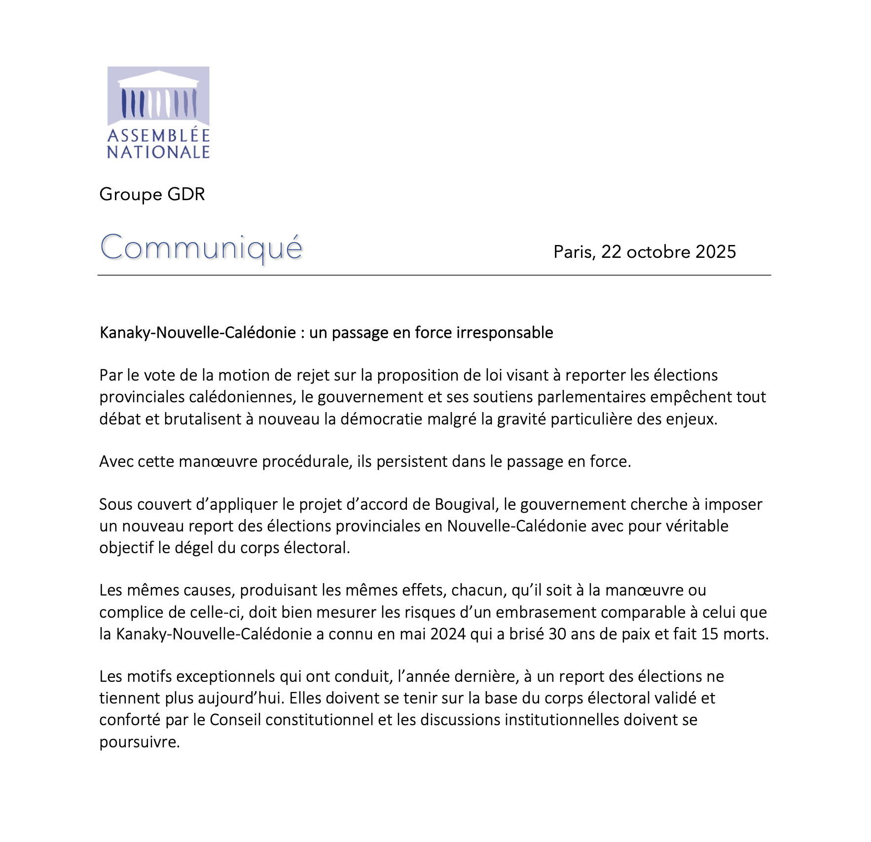 Kanaky-Nouvelle-Calédonie : un passage en force irresponsable ! (22-10-2025)