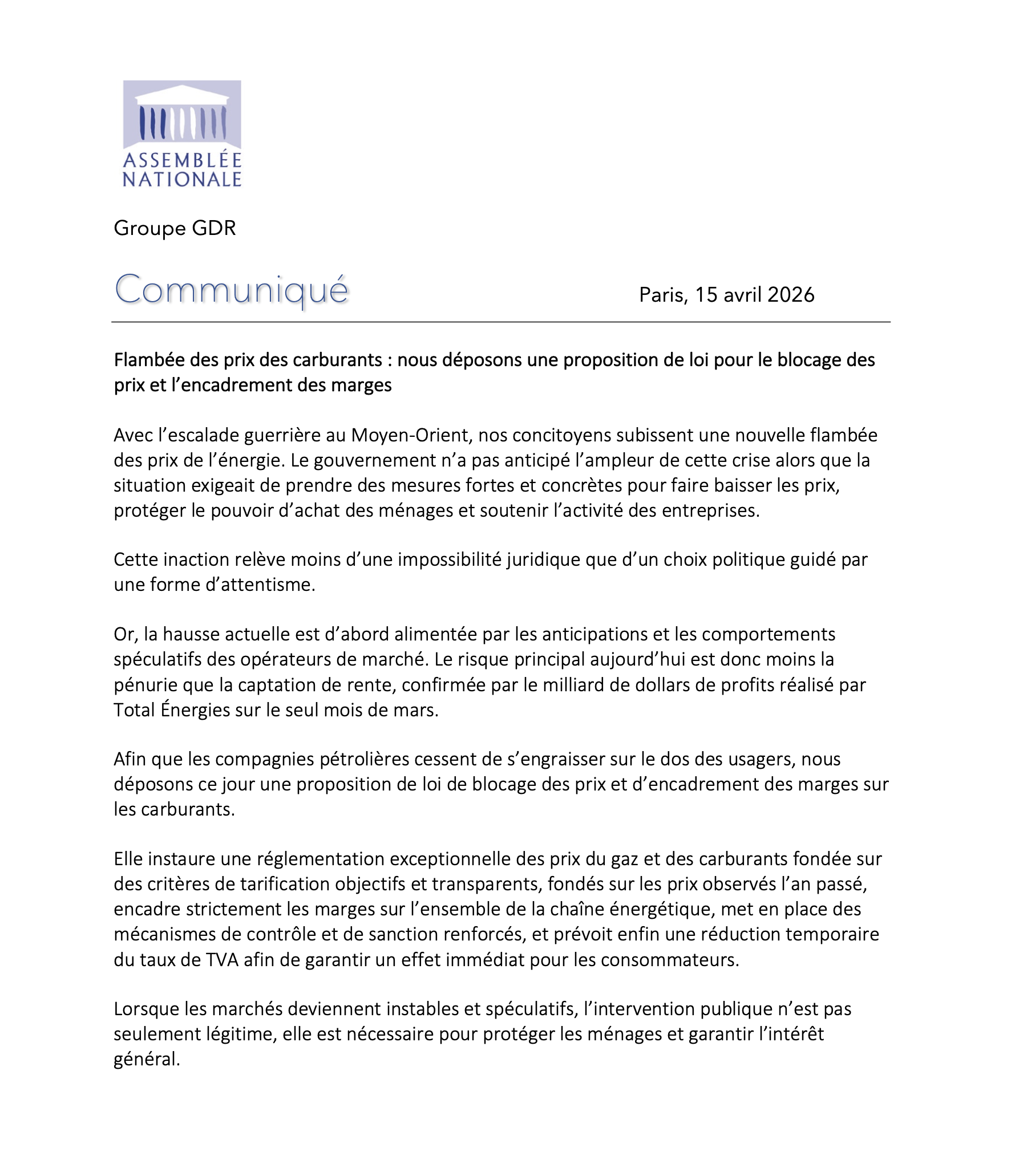 28 février - Communiqué des députés communistes :