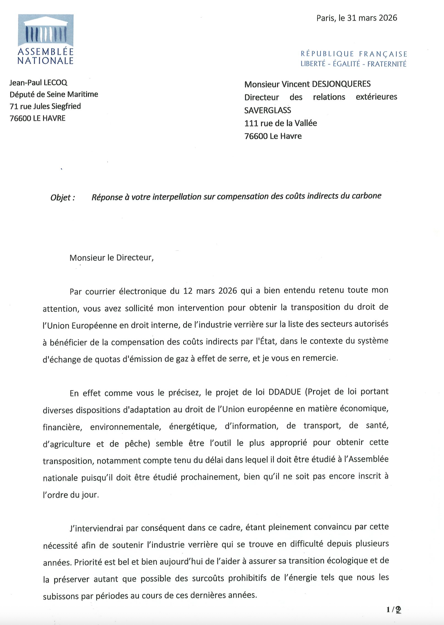 Intervention pour soutenir la filière verrière tout en lui rappelant le plan de licenciements inique qui frappe l’usine Saverglass du Havre (07-04-2026)