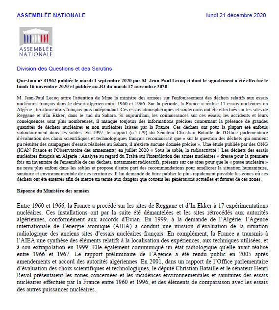 J’interroge la Ministre sur l’enfouissement des déchets relatifs aux essais nucléaires français dans le désert algérien (21-12-2020)