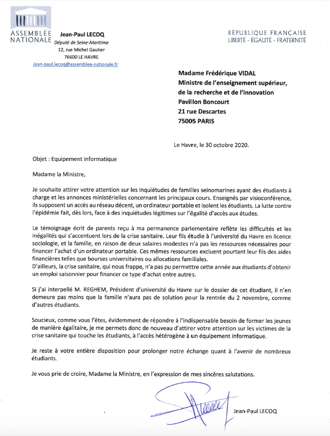 Fermeture des universités et cours à distance : j’alerte la Ministre (30-10-2020)