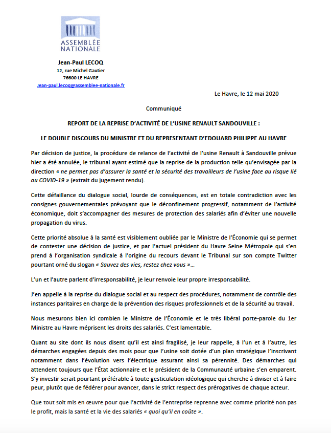 Report de la reprise d’activité de l’usine Renault-Sandouville (12-05-2020)