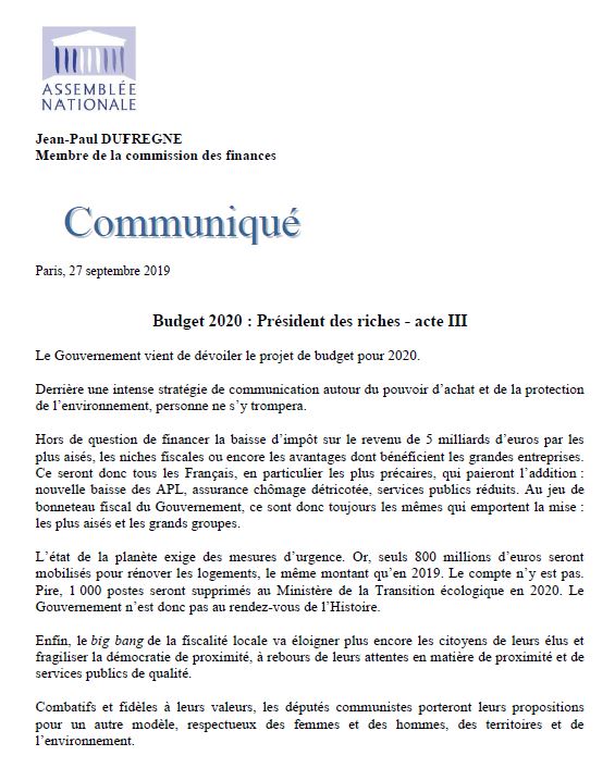 Budget 2020 de l’Etat : Président des riches - acte III (30-09-2019)