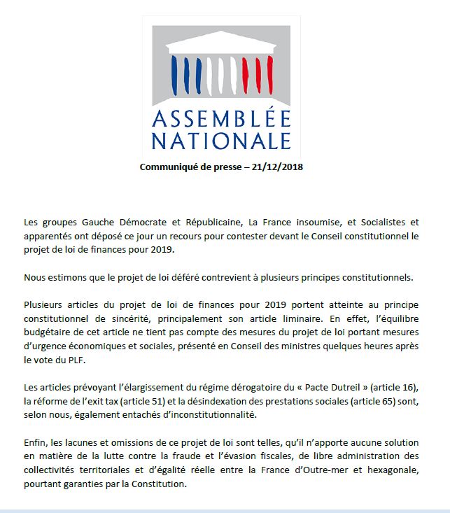Recours devant le Conseil constitutionnel contre le projet de loi de finances de l’Etat pour 2019 (21-12-2018)