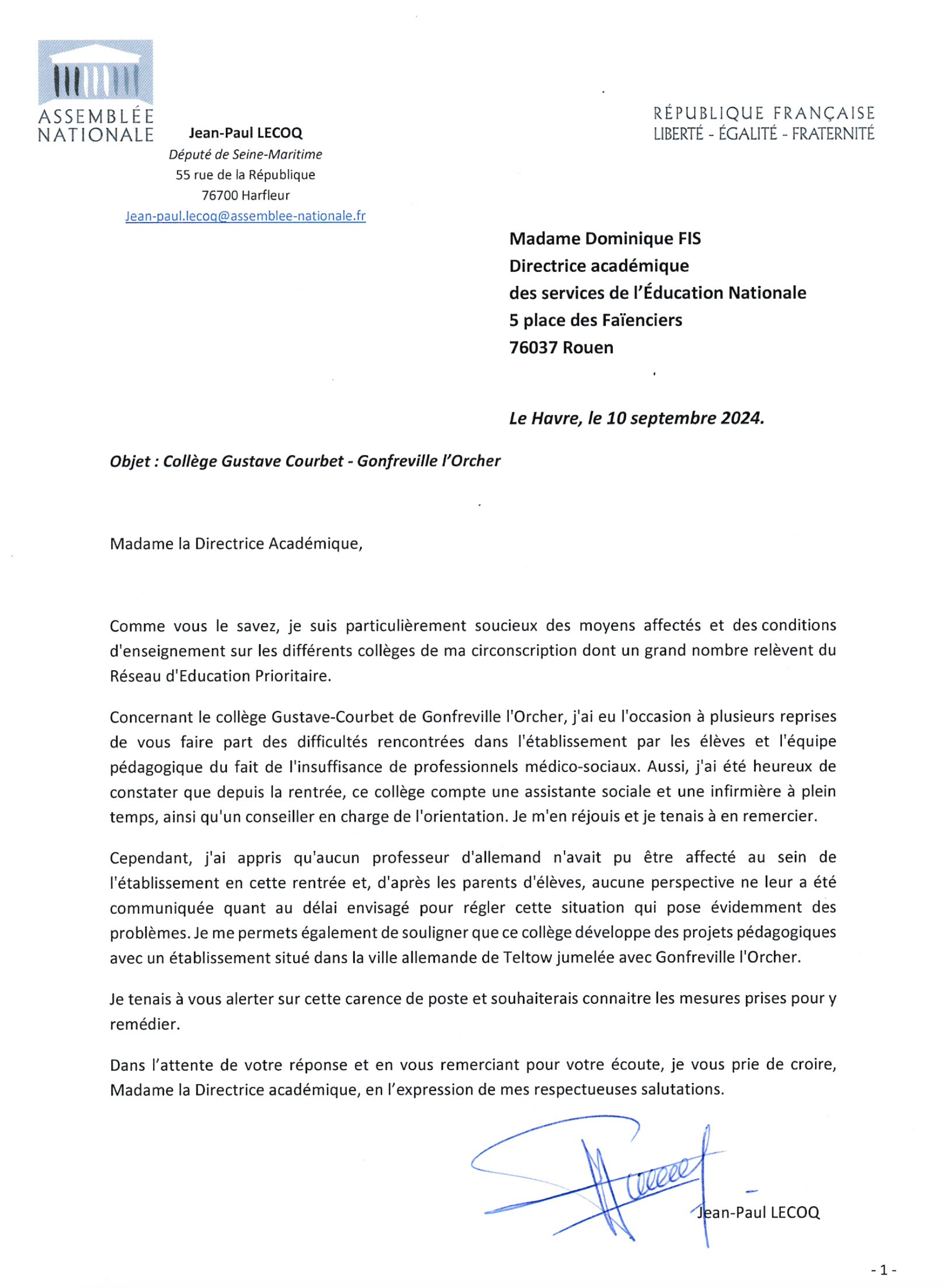Absence de professeur d’allemand au collège Courbet : j’interviens auprès de la DASEN (10-09-2024)