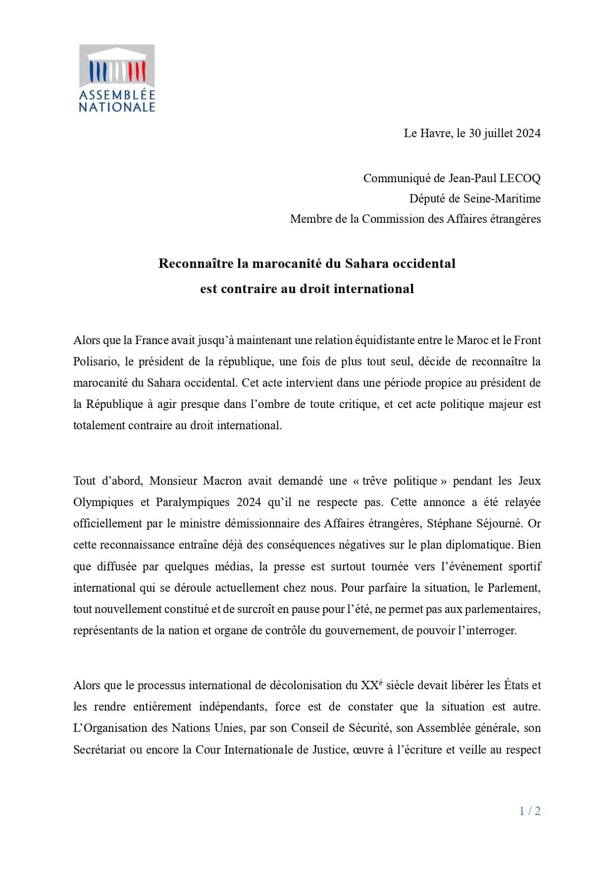 Reconnaître la marocanité du Sahara occidental est contraire au droit international (30-07-2024)