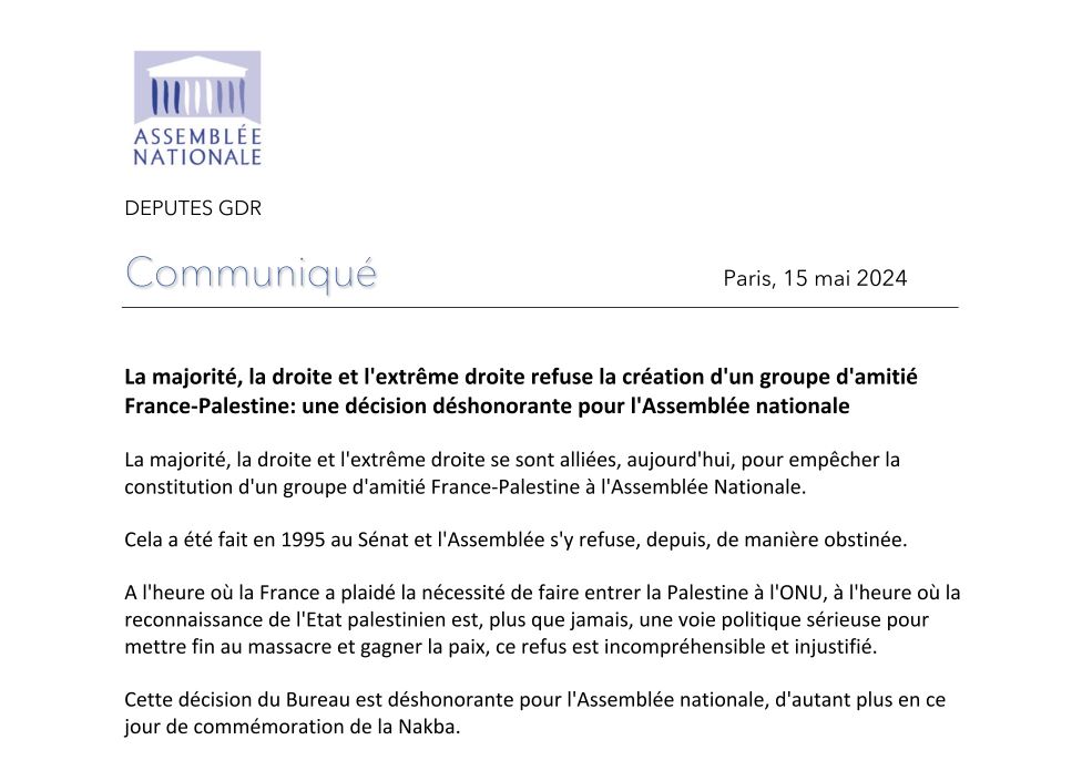 La majorité, la droite et l’extrême droite refusent la création d’un groupe d’amitié France-Palestine : une décision déshonorante pour l’Assemblée Nationale (15-05-2024)