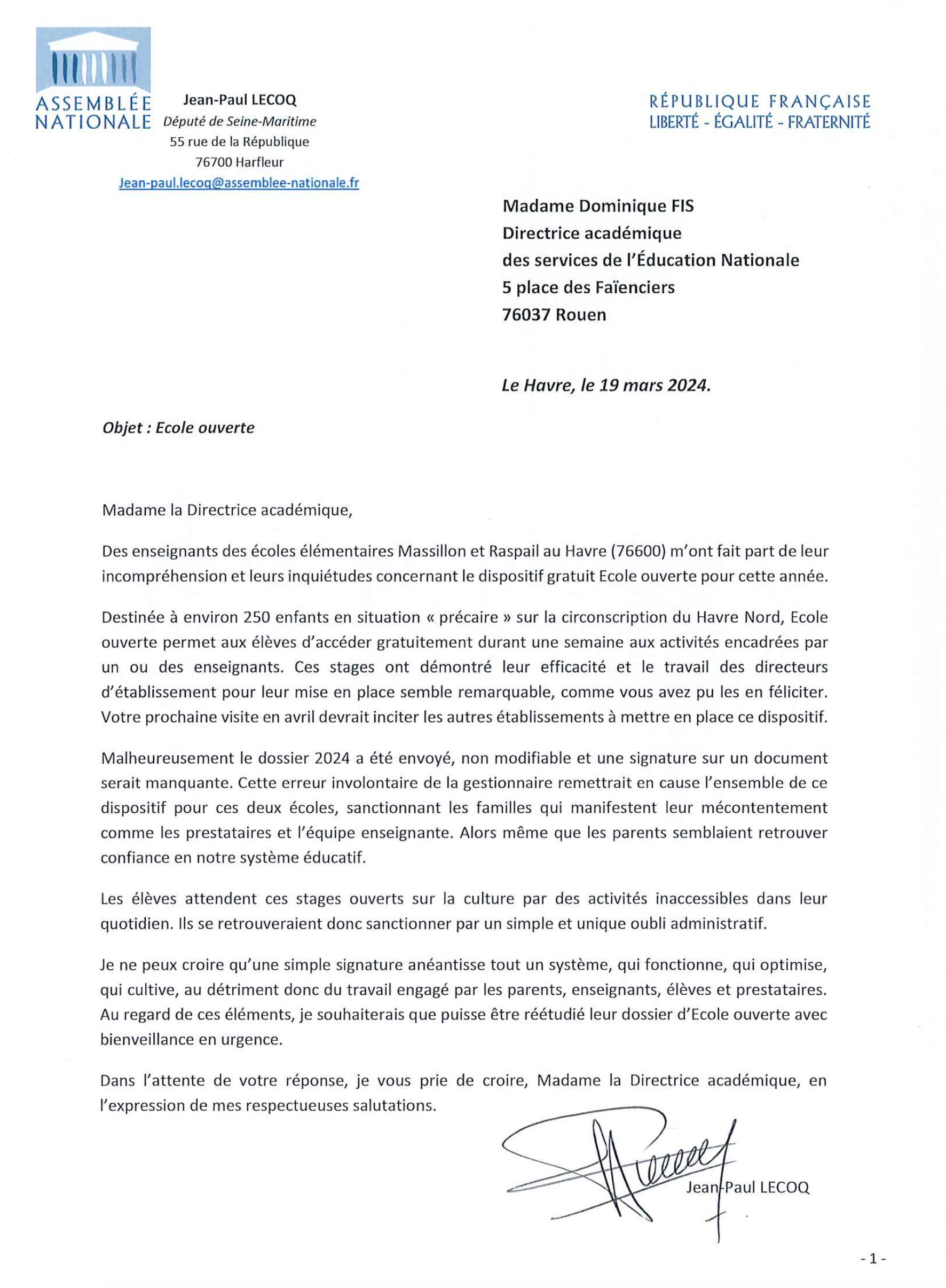 Dispositif "Ecole ouverte" menacé à Raspail-Massillon : j’interviens immédiatement (16-05-2024)