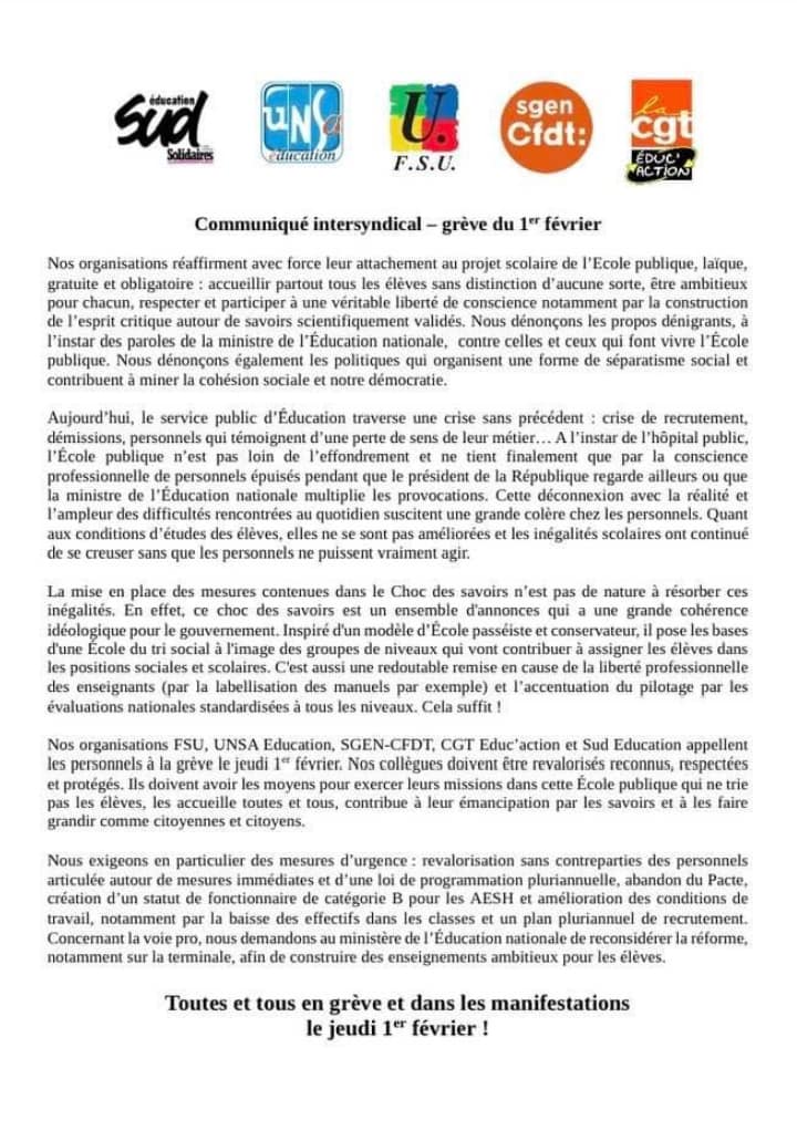 1er février - Plein soutien aux enseignants et aux agents communaux, départementaux et régionaux (…)
