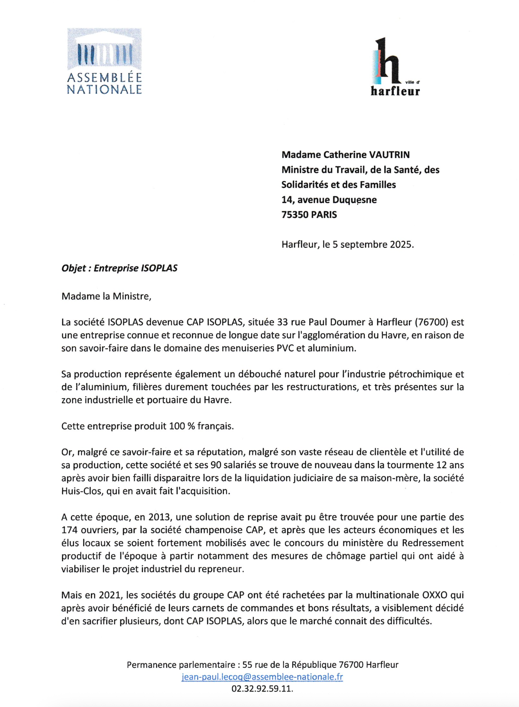 Il faut assurer l’avenir d’ISOPLAS Harfleur et de ses emplois : nous saisissons dans ce sens les ministres concernés (05-09-2025)