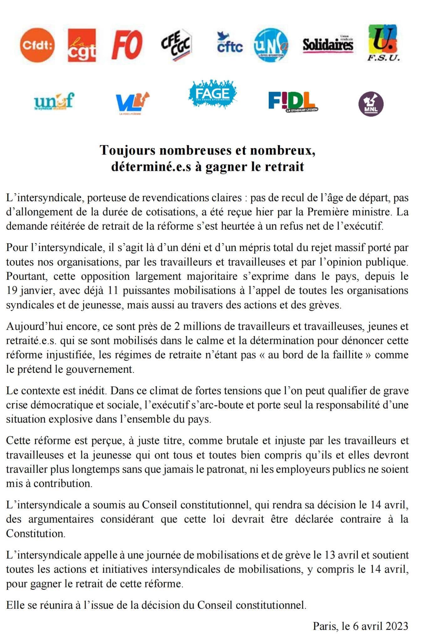 La mobilisation contre le recul des retraites se poursuit à travers tout le pays (13-04-2023)