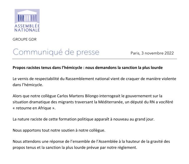 Propos racistes à l’Assemblée, le "Rassemblement National" fait horreur à la République (03-11-2022)