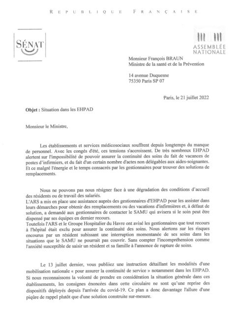 Continuité des soins des résidents des EHPAD : nous alertons Ministre et Préfet (03-08-2022)