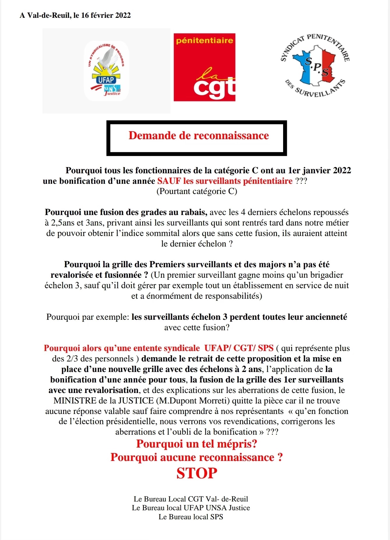 Mouvement social des personnels de la pénitentiaire : j’interviens auprès du Ministre (17-02-2022)