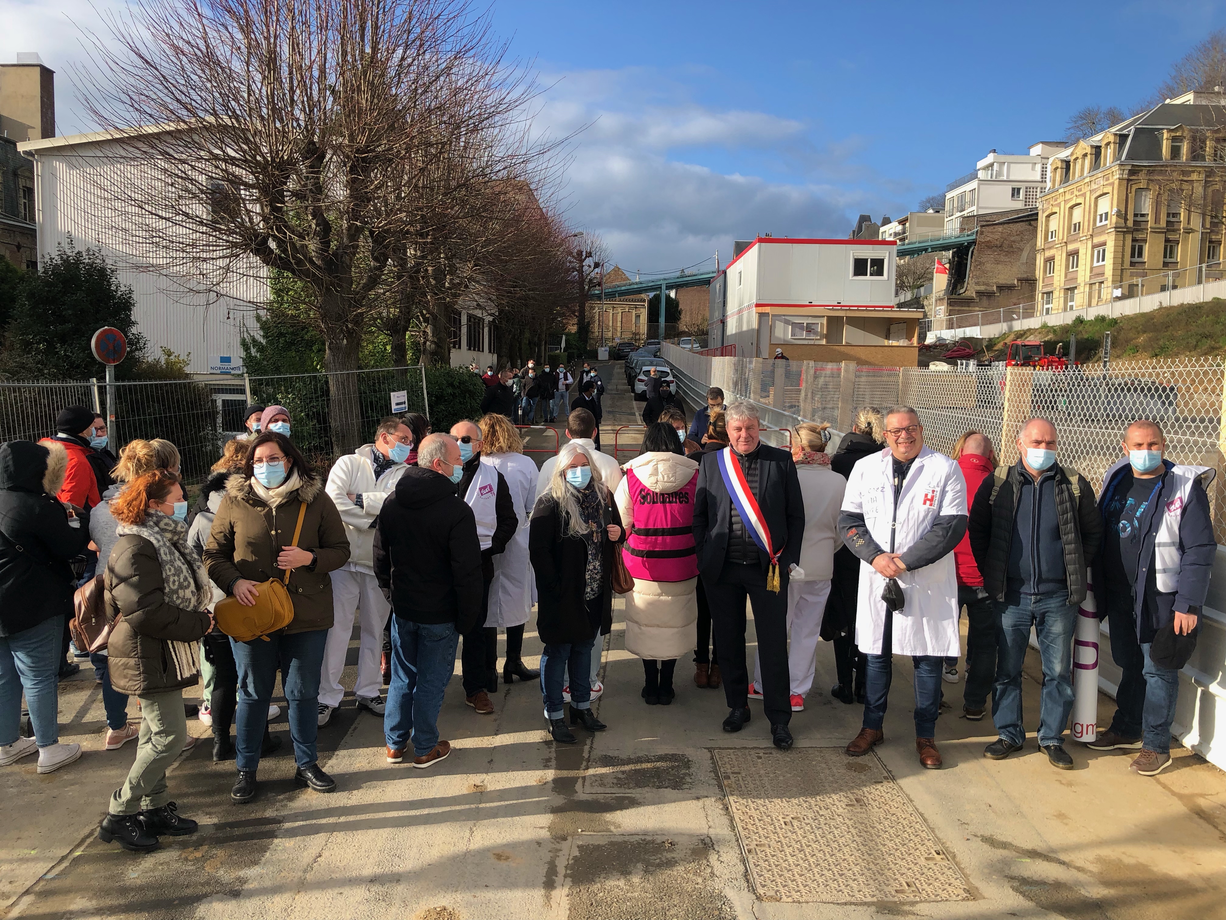 Avec les agents hospitaliers à la première pierre du nouveau bâtiment de pédopsychiatrie du GHH (31-01-2022)