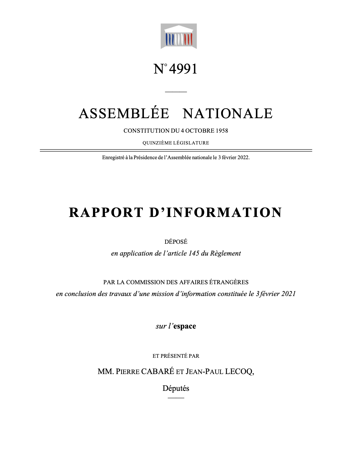 Notre rapport de mission sur la diplomatie spatiale présenté aujourd’hui (02-02-2022)