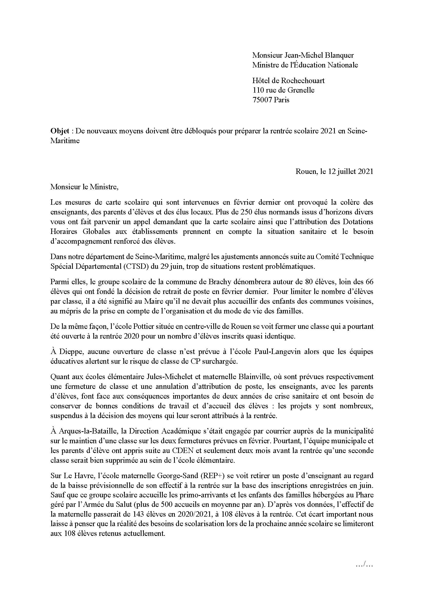Carte scolaire en Seine-Maritime : le compte n’y est pas pour la rentrée ! (13-07-2021)