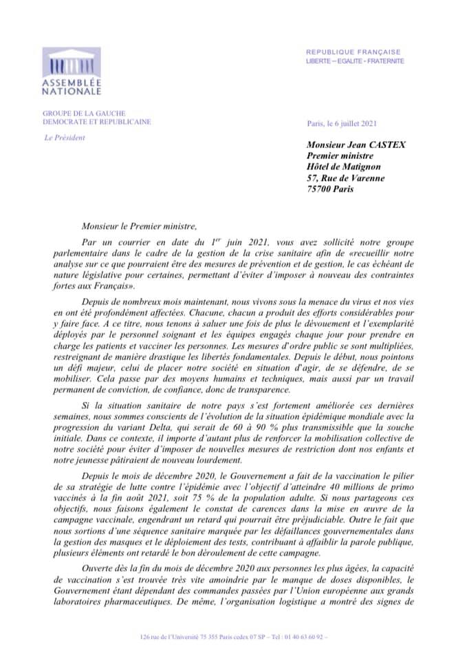 Vaccination obligatoire, pass sanitaire : nos positions exprimées au 1er Ministre (06-07-2021)