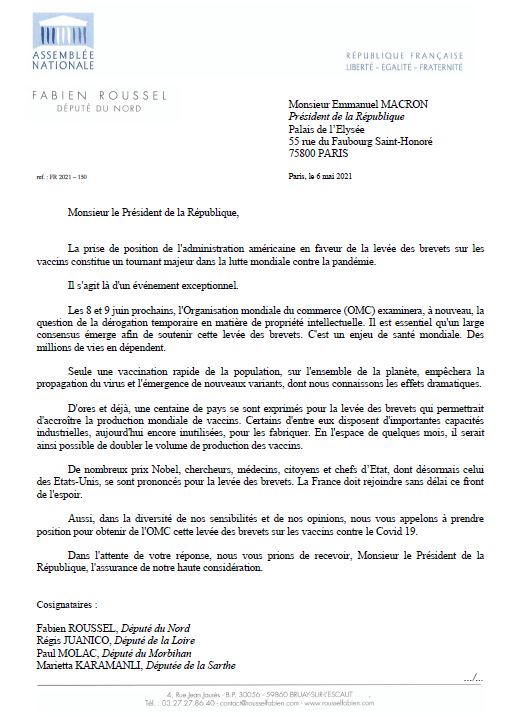 Pour la levée des brevets qui permettrait d’accroître la production mondiale de vaccins (06-05-2021)